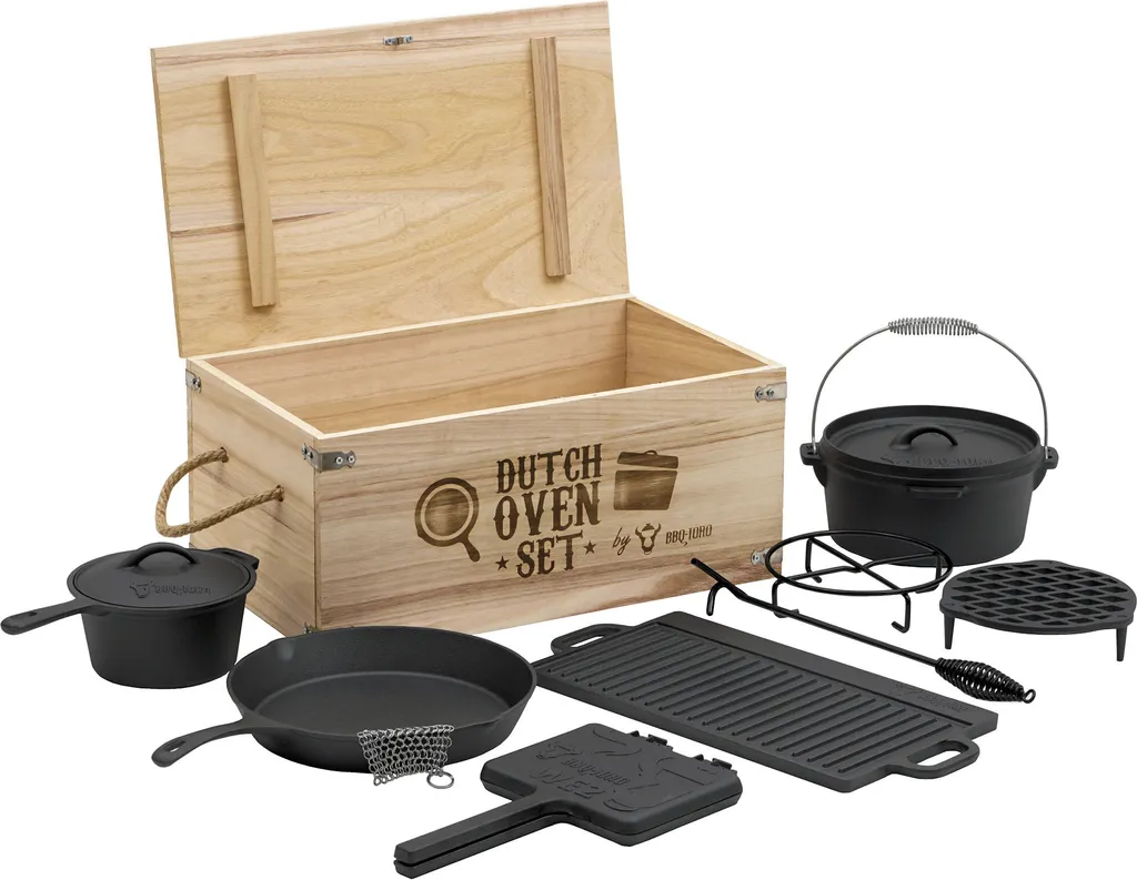 BBQ-Toro 10-teiliges Dutch Oven Set In Holzkiste Mit Waffeleisen, Stieltopf, Grillpfanne Und Mehr