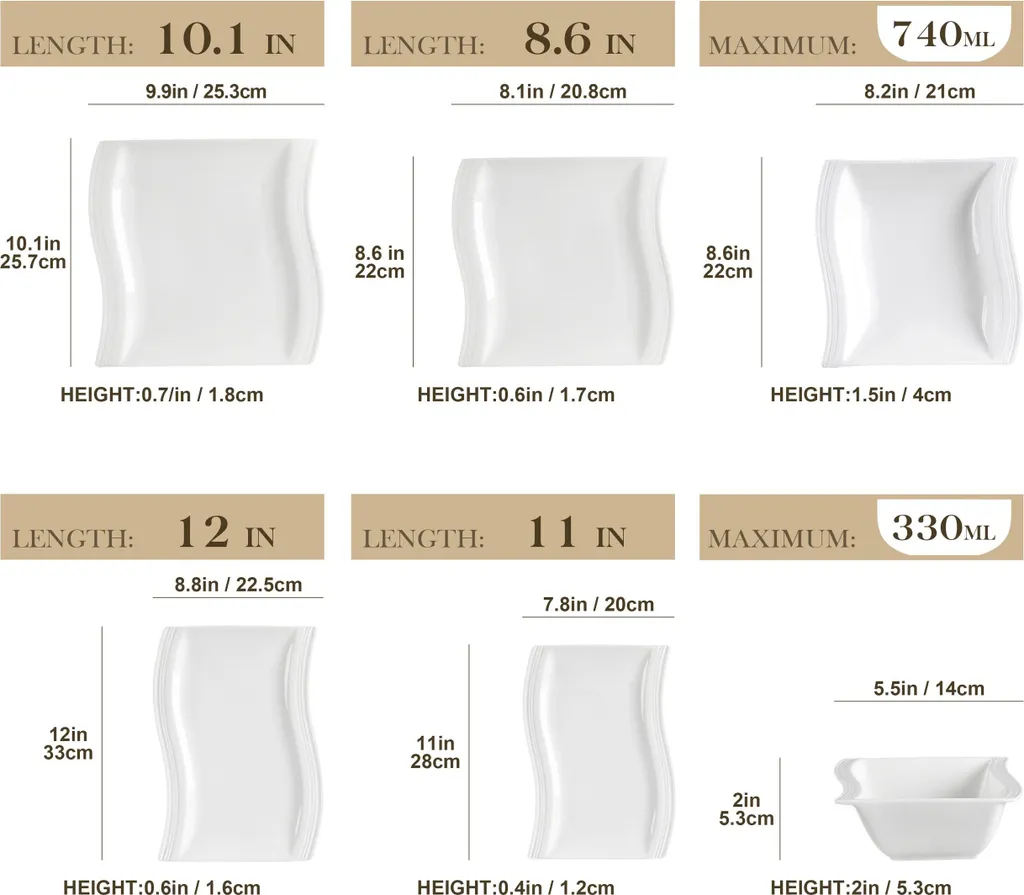 MALACASA, Serie Flora, 26 Tlg. Cremeweiß Porzellan Geschirrset Kombiservice Tafelservice Mit 6 Schalen, 6 Dessertteller, 6 Suppenteller, 6 Speiseteller Und 2 Rechteckigen Platten